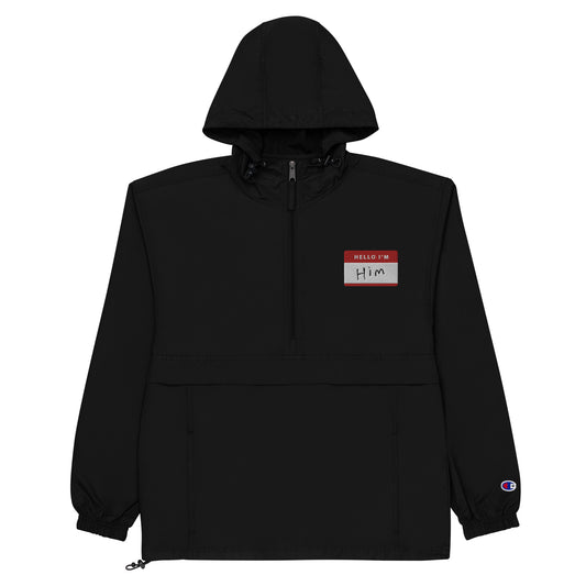 Hello, I'm Him Name Tag- Champion Packable Jacket